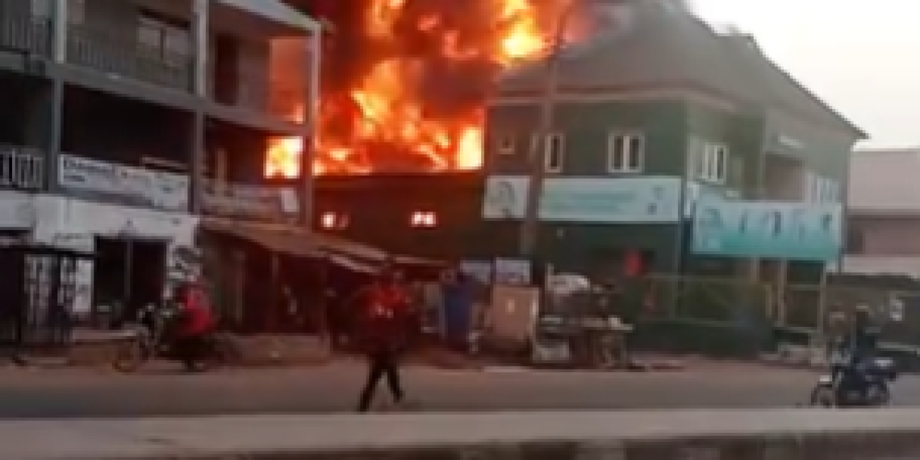 A video obtained by standarddailypressshows fire raging from behind the affected building and extending towards adjoining structures, with thick smoke filling the area.