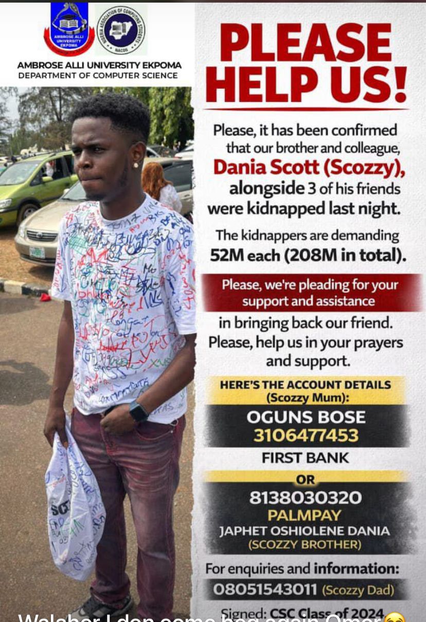 The victims, identified as Daniel Scott (popularly known as Scozzy), a graduating Computer Science student; Marvellous Ogbemudia, a 500-level Engineering student; and their associates Obitto Cornelius and Divine Uwagbale, were reportedly seized by heavily armed men near their residence along the Victorio Hotel Street axis.