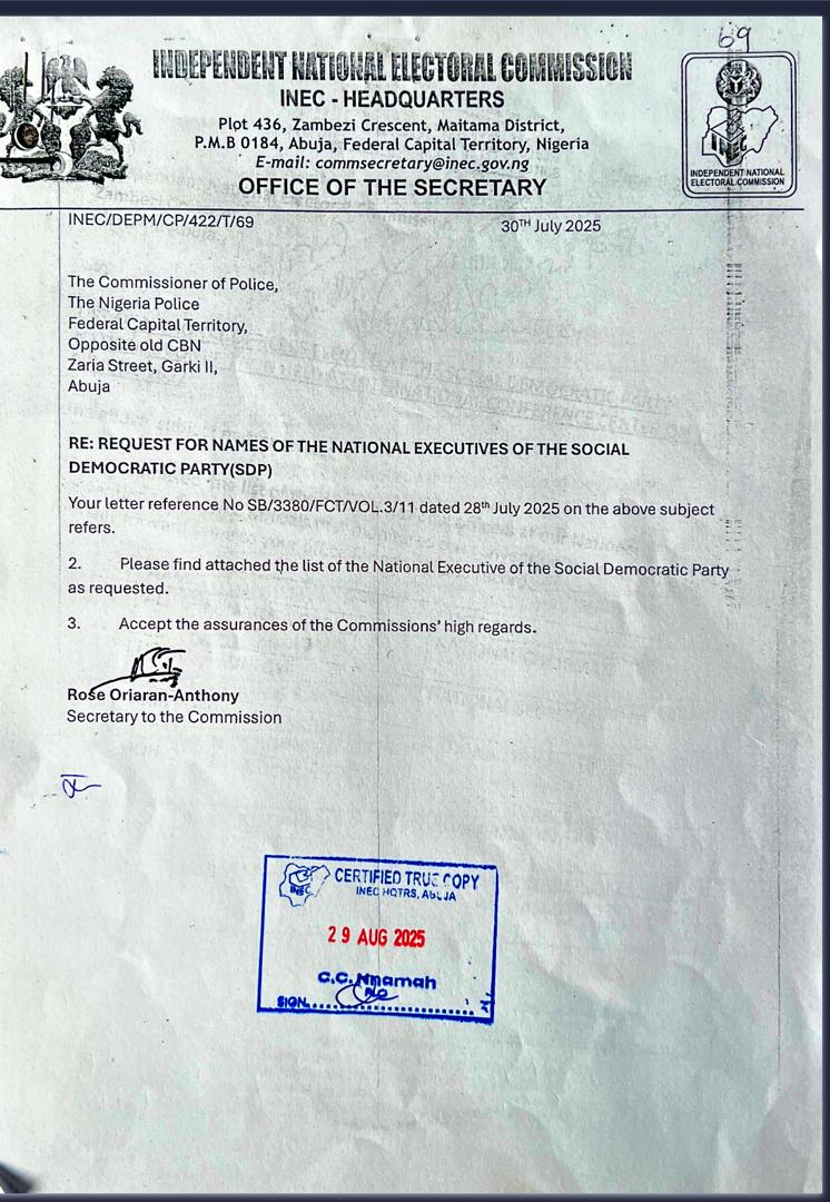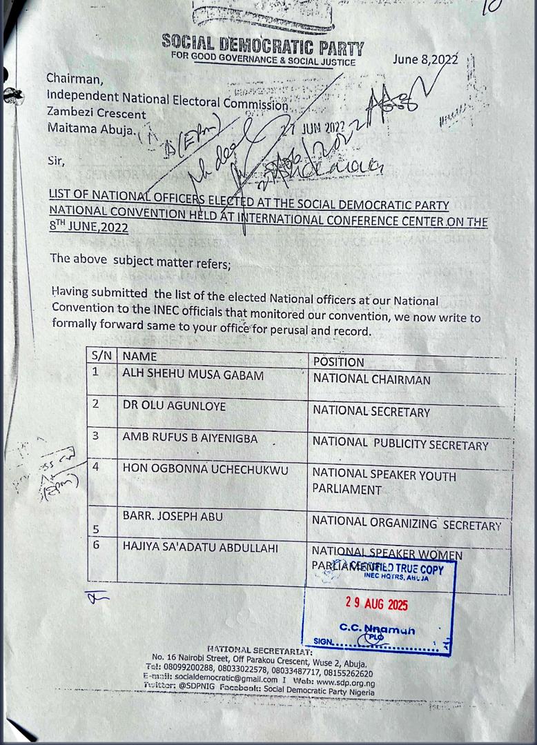 In an official letter writing to the Nigeria Police Force, dated July 30th and signed by its Secretary, Rose Oriaran-Anthony and seen by the media, INEC affirms the leadership of Alhaji Shehu Musa Gabam, National Chairman Social Democratic Party.
