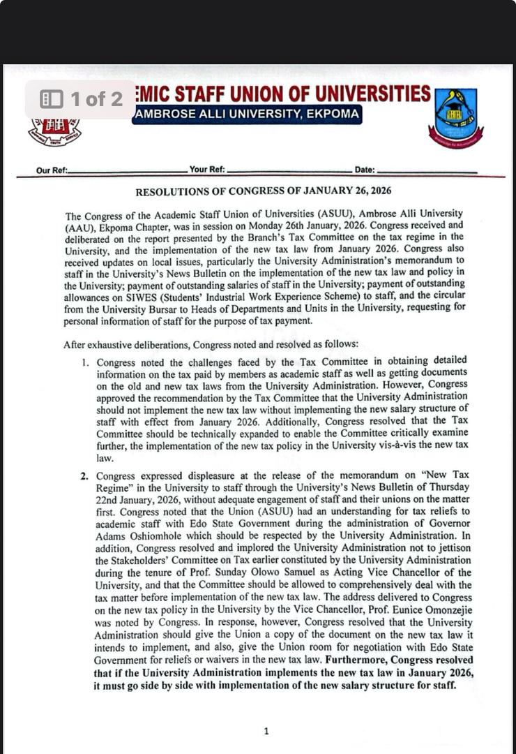 Ekpoma, January 26, 2026 — Staff unions at Ambrose Alli University (AAU), Ekpoma, have passed a series of far-reaching resolutions addressing tax policy, salary arrears, allowances, and administrative appointments. The Academic Staff Union of Universities (ASUU), AAU Chapter, and the Joint Action Committee (JAC) comprising the National Association of Academic Technologists (NAAT), the Non-Academic Staff Union of Universities (NASU), and the Senior Staff Association of Nigerian Universities (SSANU), convened separate congresses on January 26, 2026, and issued strong statements challenging recent decisions of the university administration.