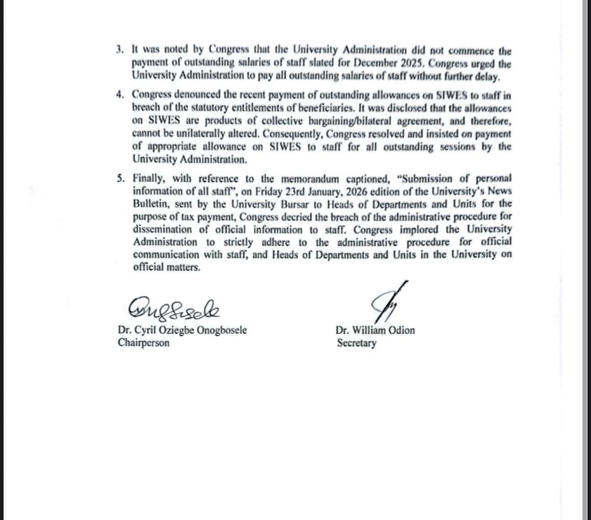 – Congress urged immediate payment of staff salaries for December 2025 and all outstanding arrears.
